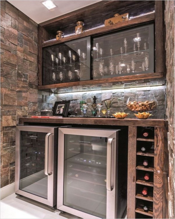 40 Best Man Cave Ideas To Inspire You In 2021 - Small man cave with mini bar, stools, fridge and plush brown leather sofa.
